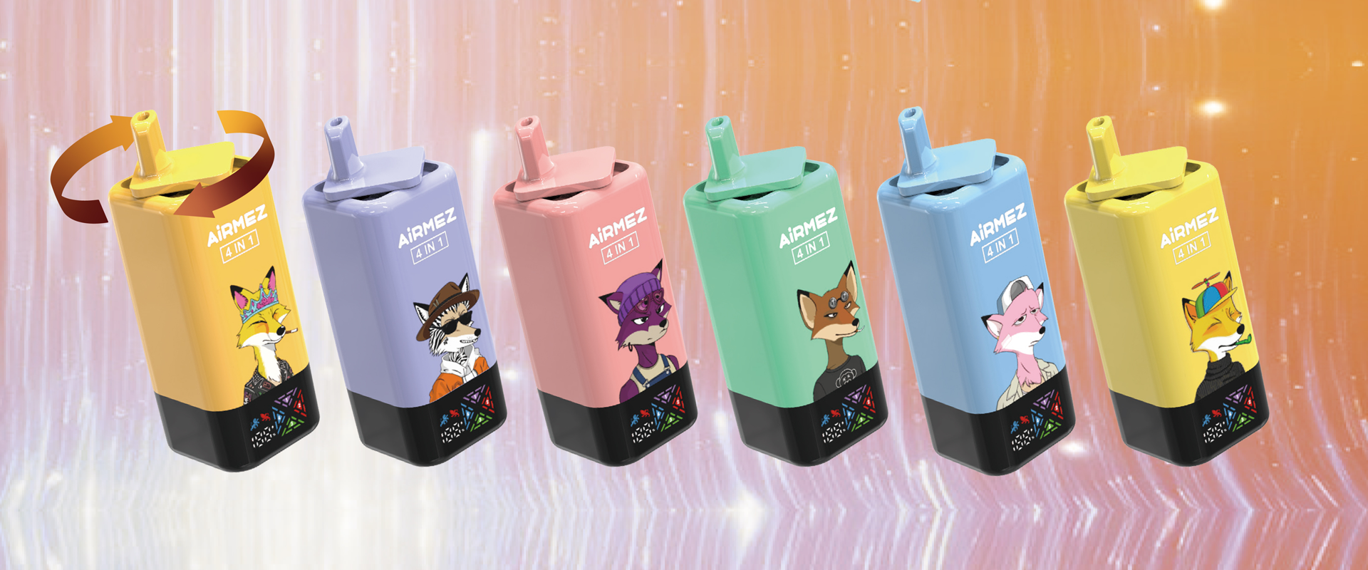Airmez Fox 4in1 is a rechargeable vape with 120,000 puffs, a mini screen showing battery + flavor, and an easy twist-to-switch 4-flavor system. Portable, stylish, and super cost-effective – basically 4 vapes in one.